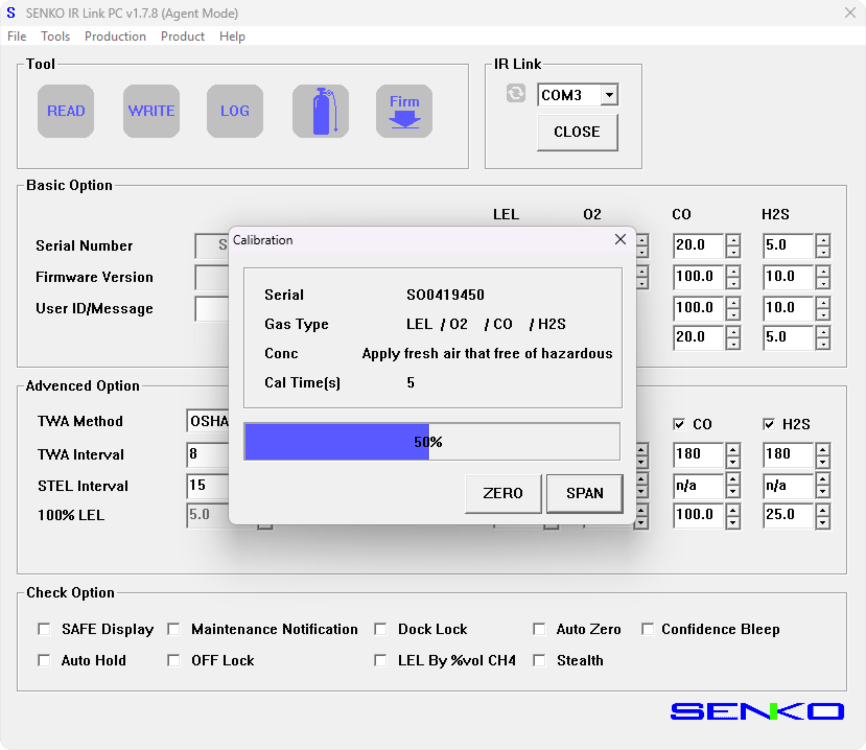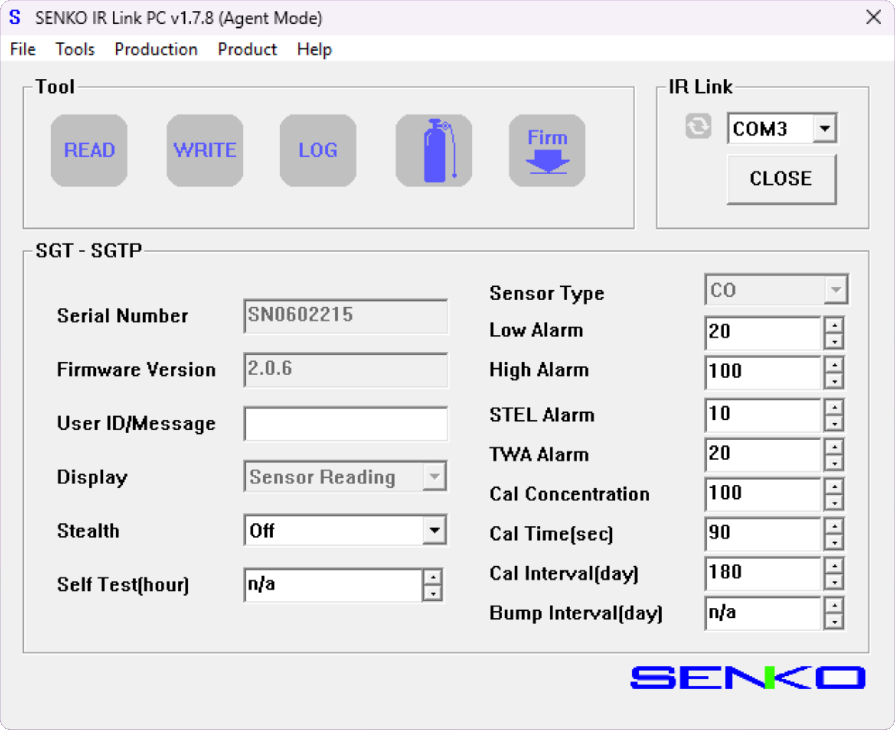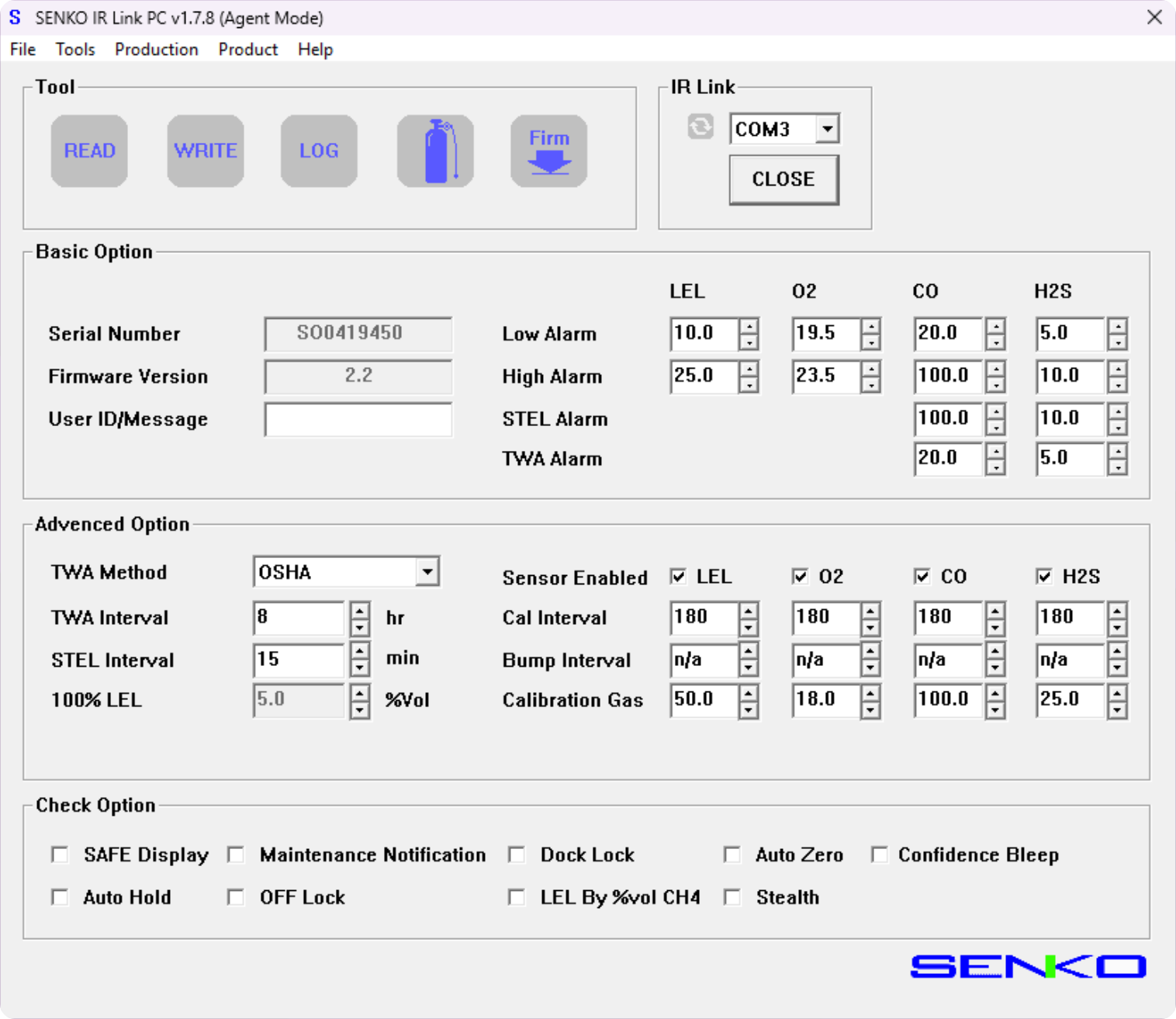 SENKO IR Link PC Agent je softwarový program, který umožňuje snadnou konfiguraci, kalibraci a správu dat přenosných detektorů plynů SENKO prostřednictvím počítače, včetně stahování záznamů měření, nastavování alarmů a doplňkových funkcí.